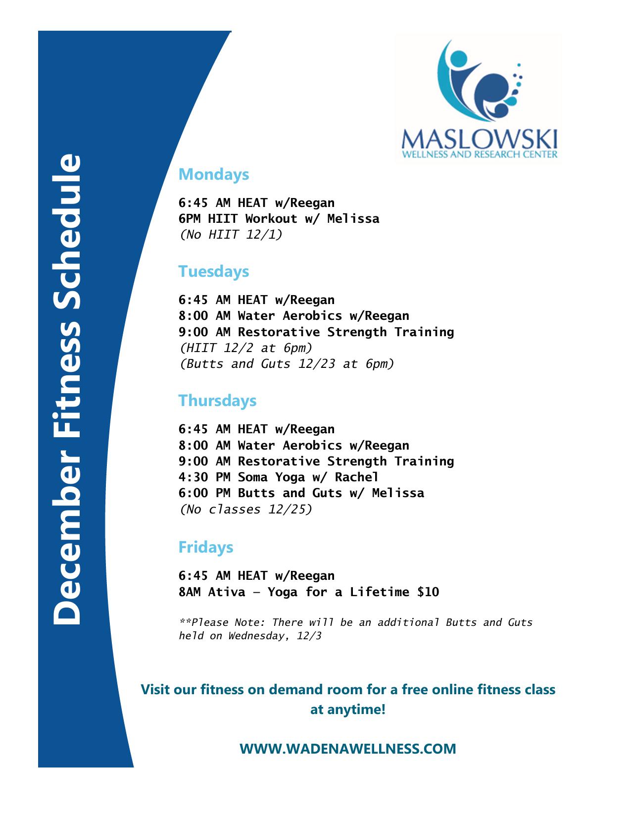 The Maslowski Wellness and Research Center offers a wide variety of fitness classes. All classes are free with membership or purchase of a day pass unless listed otherwise. Stop in and check them out!